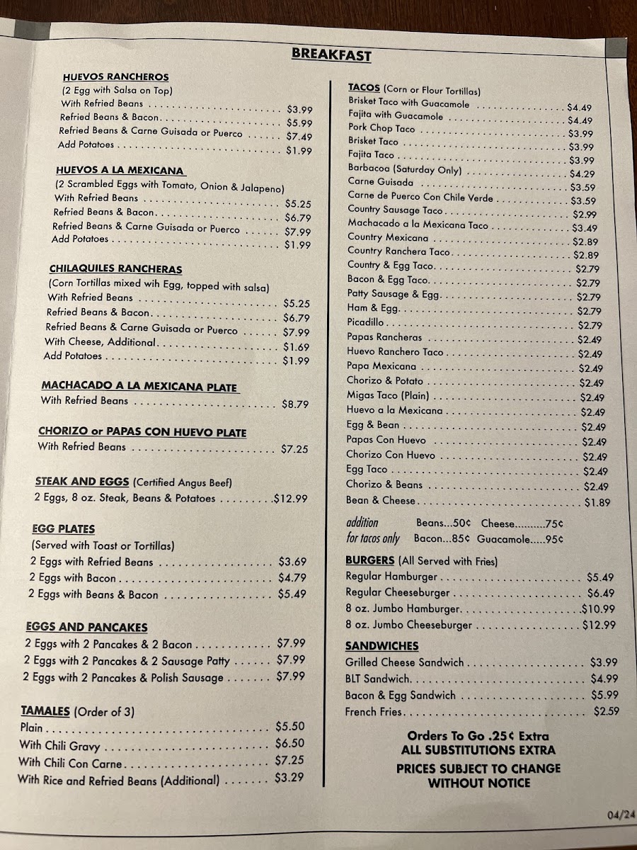Breakfast Plates: The breakfast menu highlights classic egg plates with combinations like two eggs served with refried beans, bacon, or both beans and bacon. There are also various breakfast tacos featuring ingredients such as chorizo and egg, bacon and egg, and other popular fillings.