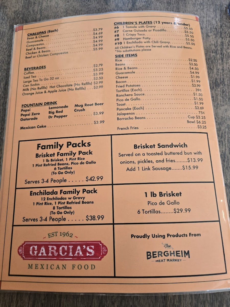 The menu at Garcia's Mexican Food To Go features a variety of traditional Mexican dishes with a strong focus on brisket and breakfast offerings. It is organized into several categories that cater to different dining preferences throughout the day.