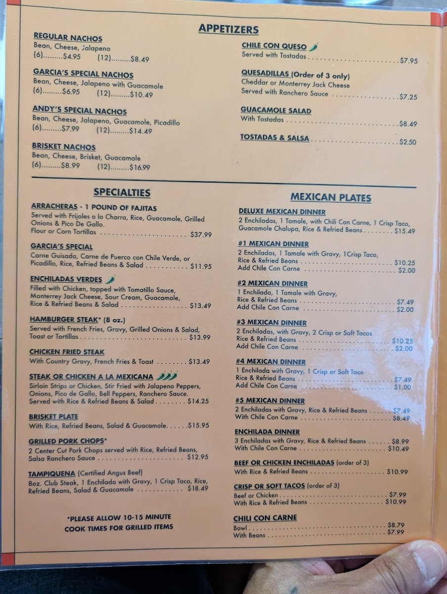 Appetizers and Light Bites: This section includes several types of nachos, such as Regular Nachos with beans, cheese, and jalapenos; Garcia's Special Nachos that add guacamole; Andy's Special Nachos which include picadillo; and Brisket Nachos featuring brisket and guacamole. Other starters include Chile Con Queso served with tostadas, a guacamole salad, and tostadas accompanied by salsa.