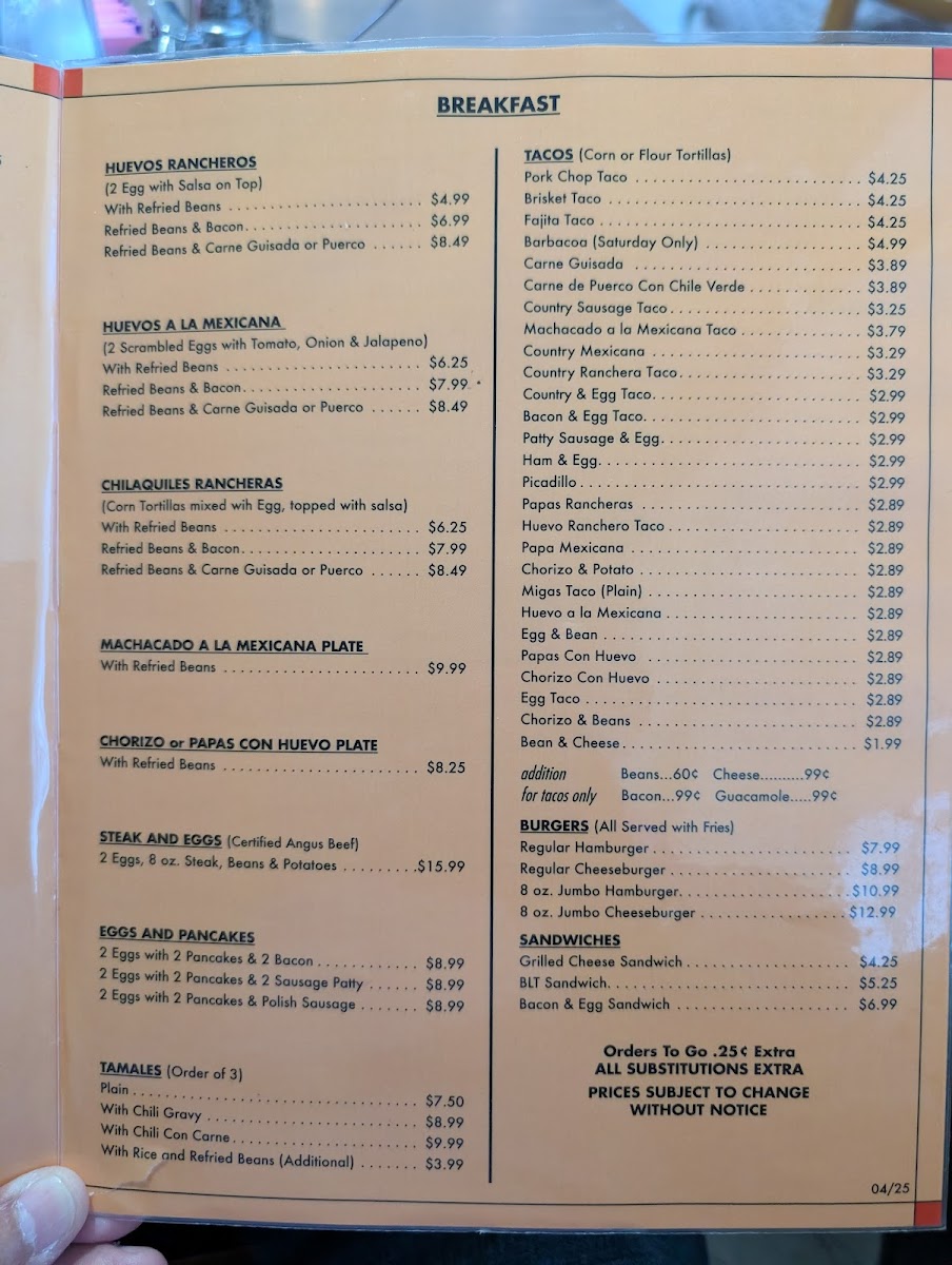 Additional Offerings: Customers can order brisket by the pound, which comes with tortillas and pico de gallo. Daily specials are featured but vary regularly.